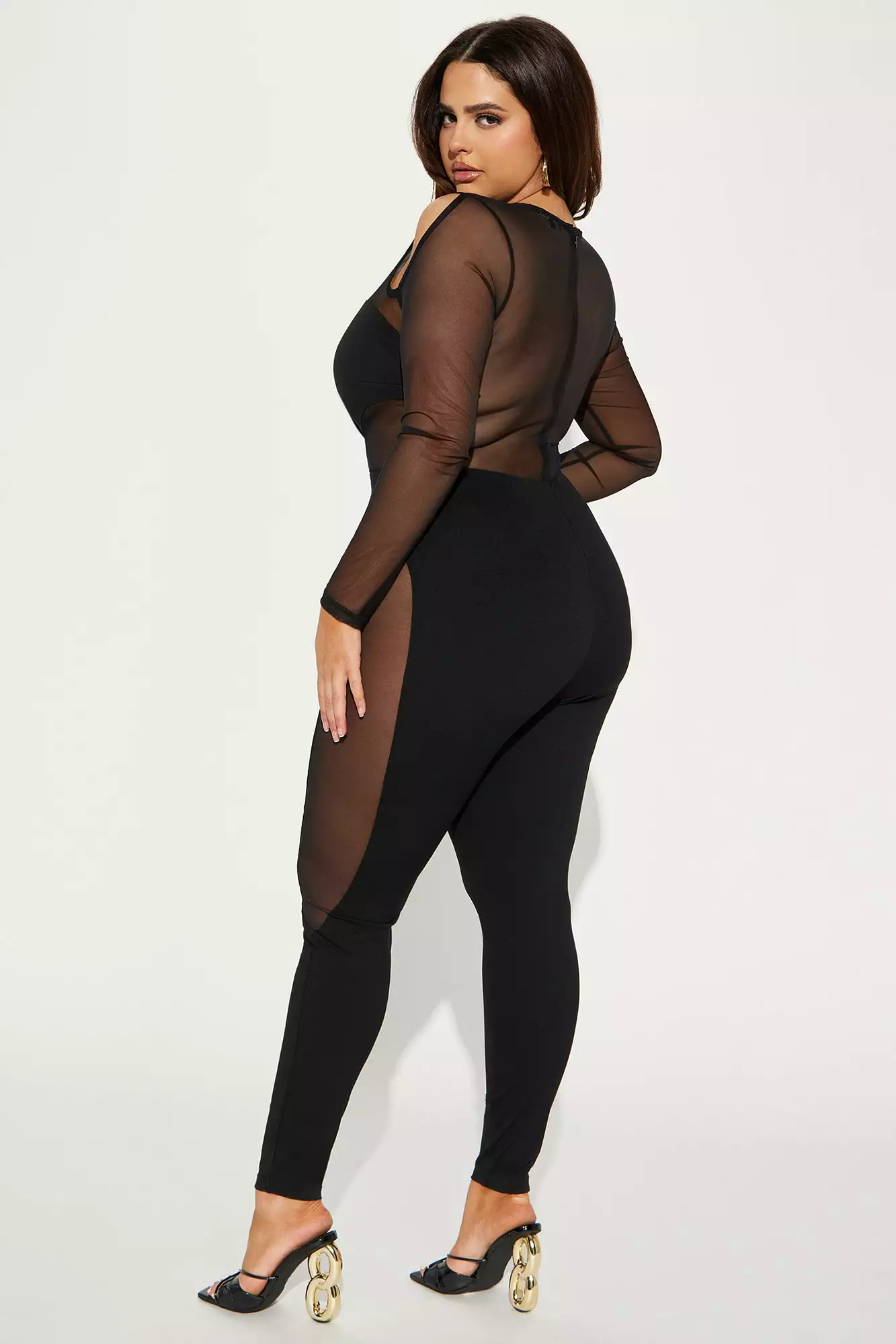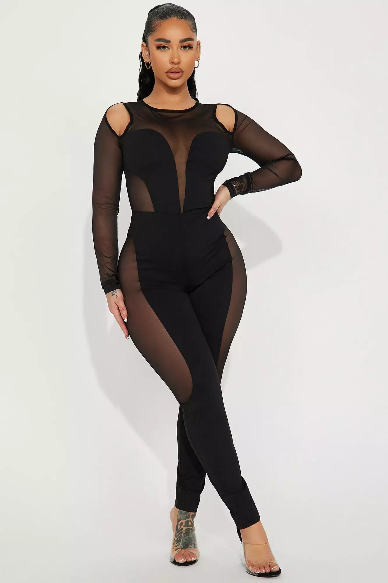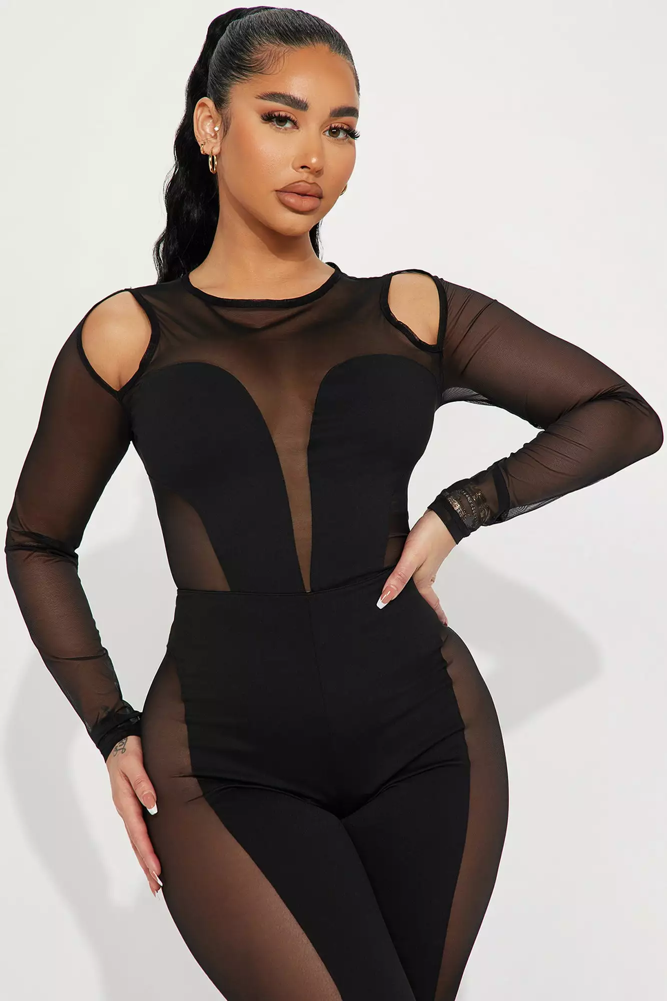 SKU: 6538099261564 Category: New In Tags: All Promo, Bogo2023, Bogodec, Color:Black, ColorFam-Black, Detail:Cut Out, Fabric:Mesh, Feb30, Jumpsuits, Marbogo, Neckline:High Neck, New In, Occasion:Club, Plus, REGPRICE, Rompers and Jumpsuits, Sleeve:Long Sleeve, WOMENS