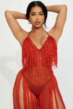 Fashion Nova Tropical Wanderlust Crochet Fringe Sunsuit – Rust